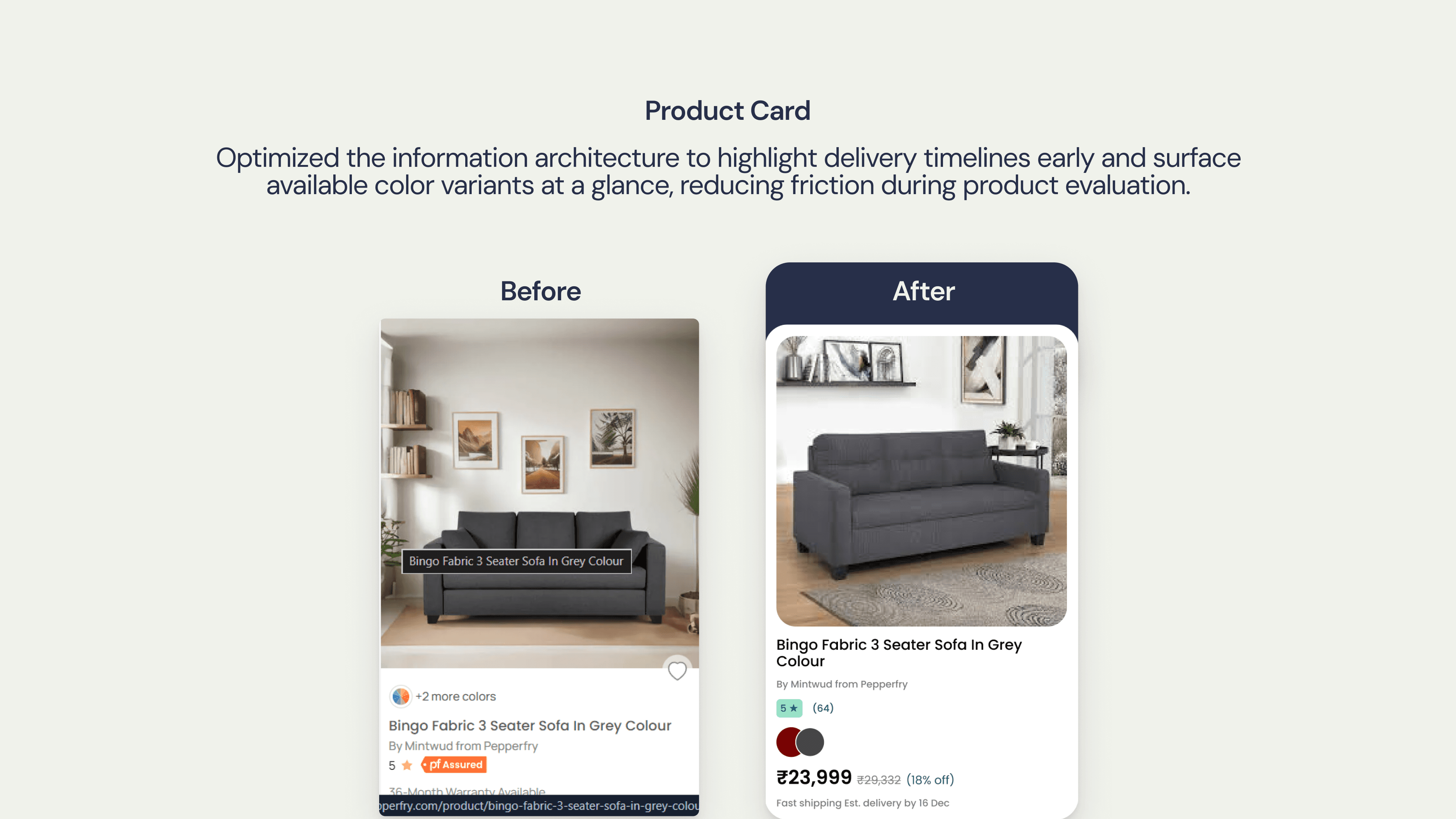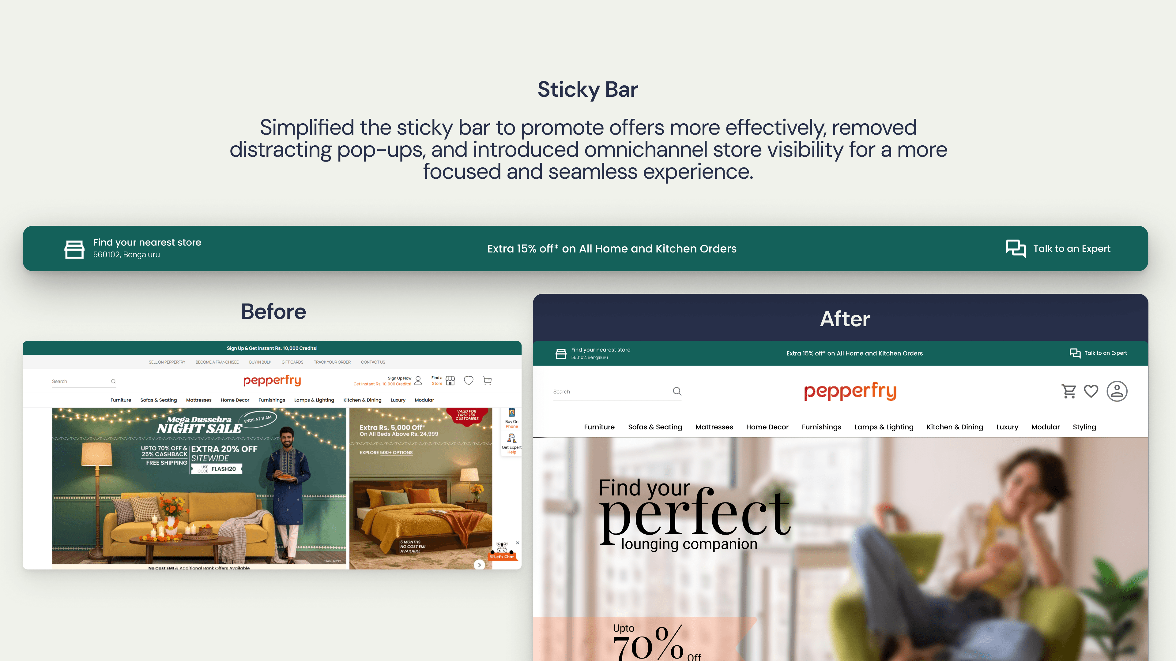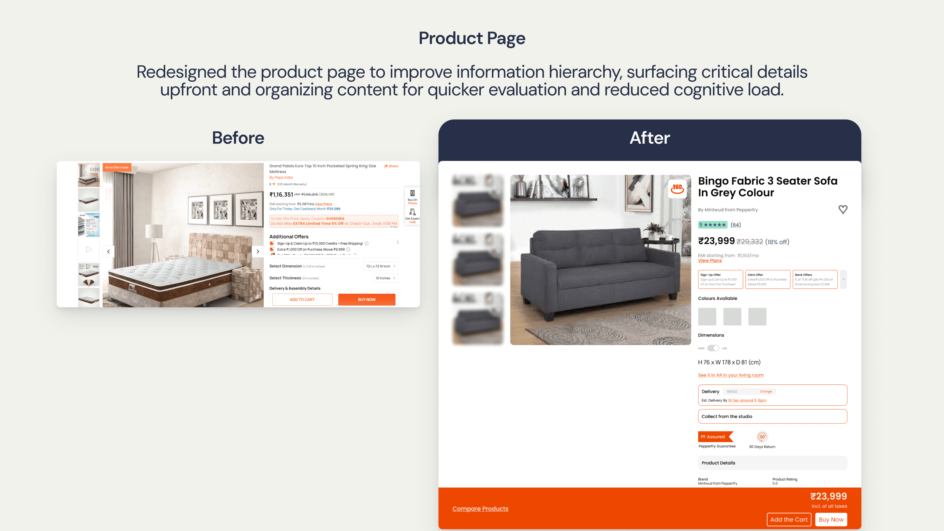 Shopping for furniture online can often feel overwhelming due to excessive choices and complex navigation. This project examines these challenges within Pepperfry, using user insights to design a more streamlined and user-friendly experience.